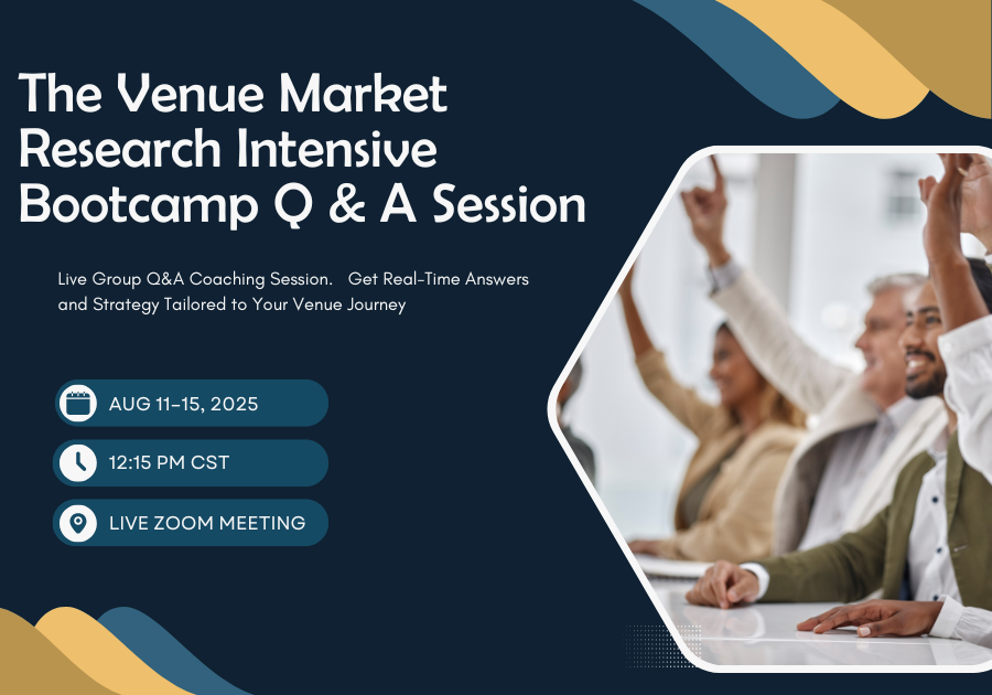 Join this exclusive 60-minute group coaching session where venue expert Bonnie Hawthorne answers your most pressing questions, provides personalized feedback, and helps you move forward with clarity and confidence. Perfect for aspiring venue owners who want expert insight tailored to their unique ideas. Only $27 — limited spots available!