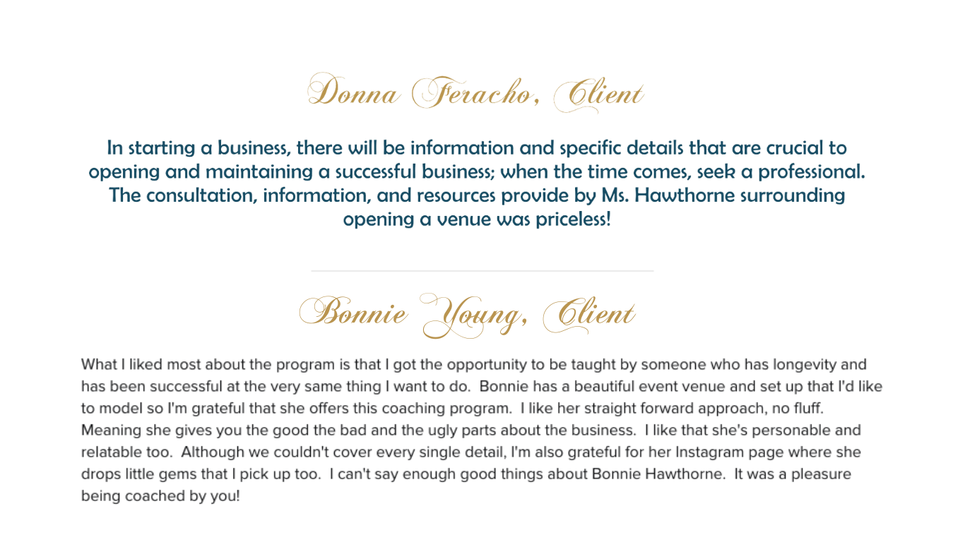 Bonnie Hawthorne brings over 20 years of experience in the events industry. With a Master’s Degree in Business, she is dedicated to coaching both venue owners and aspiring venue owners. Her journey began during her military service, where she honed her skills by planning and organizing international events and travel. After retiring, she transitioned to corporate America, working as an executive assistant responsible for managing internal and external meetings for the CEO.