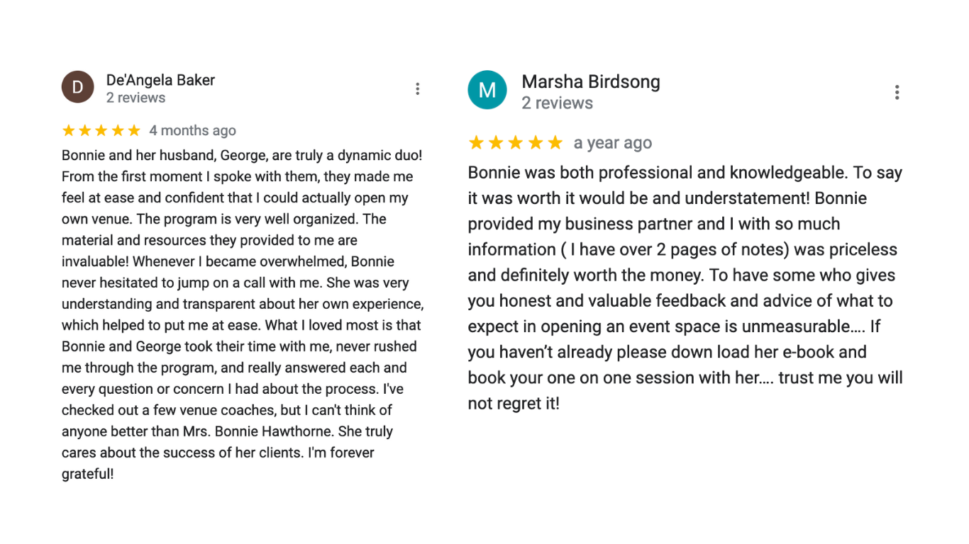 Recognizing the challenges she faced without proper coaching when starting her event venues, she was inspired to become a coach herself. She is passionate about guiding new and aspiring venue owners, ensuring they begin their journey with a solid foundation and avoid the frustrations she encountered.